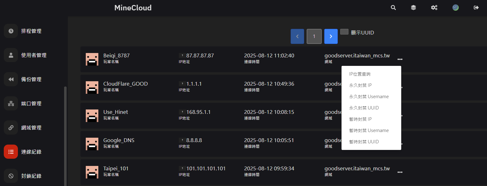 1. 至面板左側選擇「連線紀錄」即可看到曾經連線過的玩家相關資訊,點選右側 三個點 可開啟附加功能進行相關操作