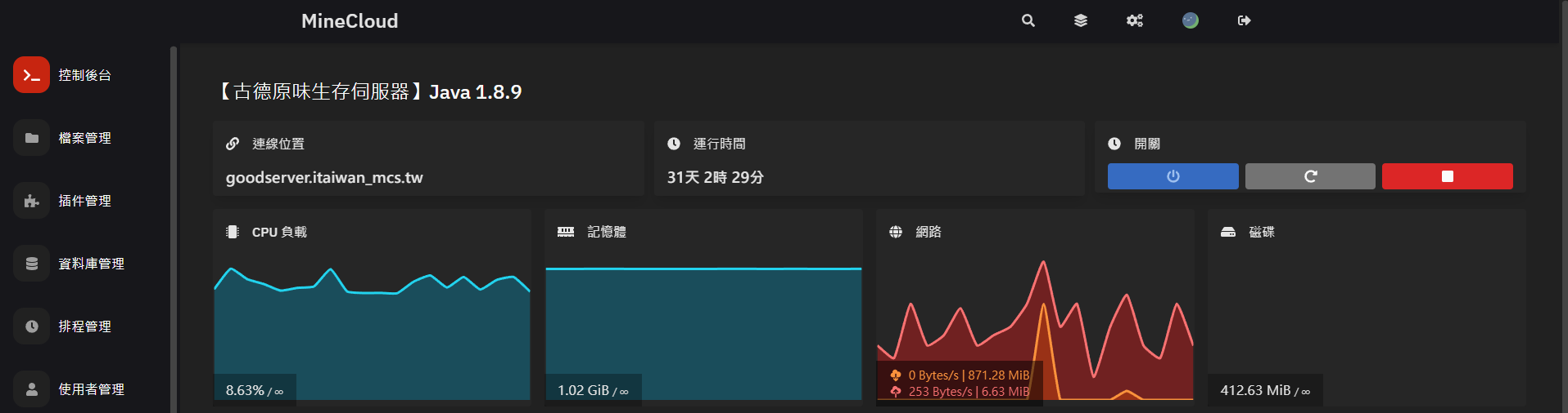 1. 面板左側選擇「控制後台」可查看伺服器相關資訊