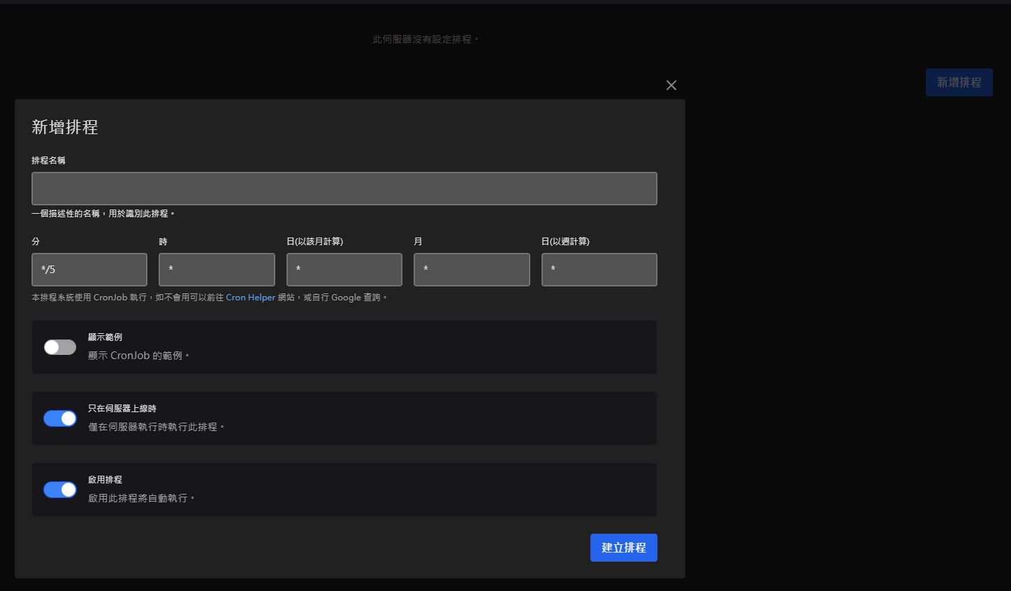 排程時間設定(每隔多久讓排程執行) 設定請參考 Cron Helper 或啟用第一個選項查看範例