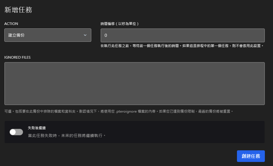 Ignored Files 選項為可選值,為忽略備份檔案選項(一行為一個,請使用絕對路徑)