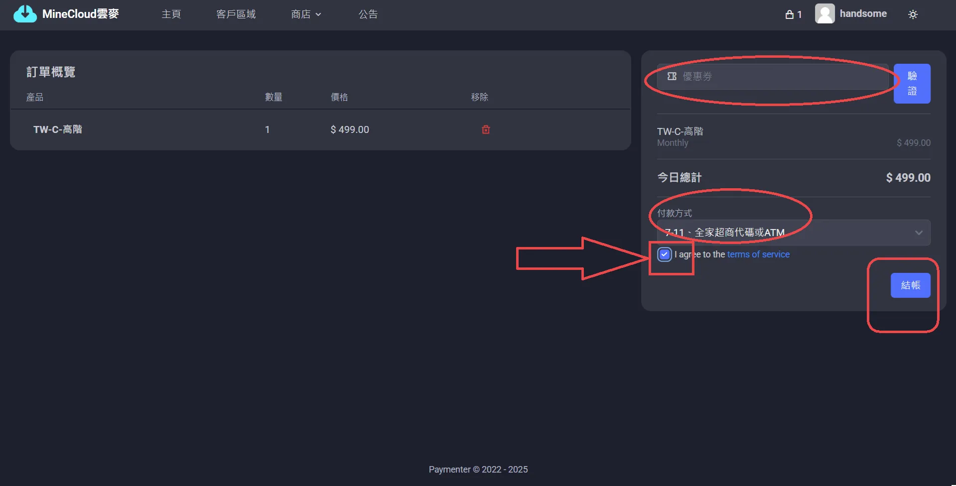 - 若有優惠券請填入,並選擇付款方式,請勿必閱讀完服務條款後勾選即同意