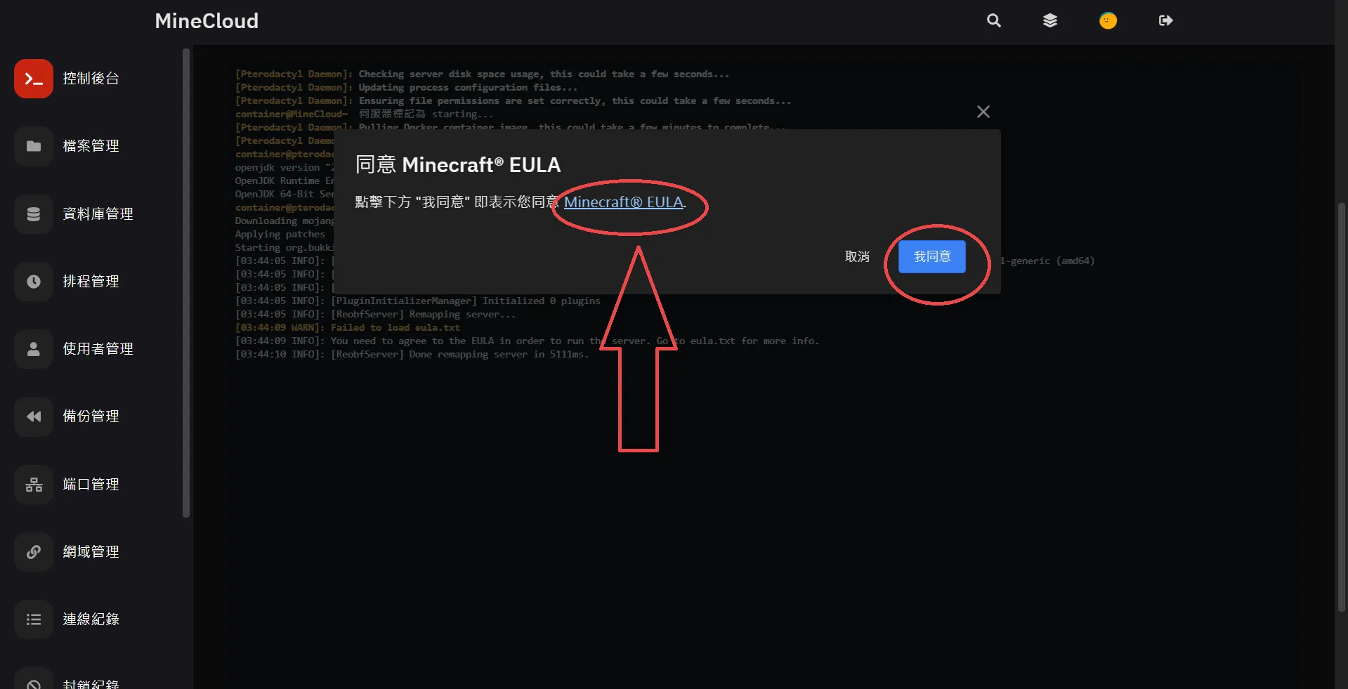 - 首次啟動請依照指示閱讀Minecraft EULA 並點擊我同意