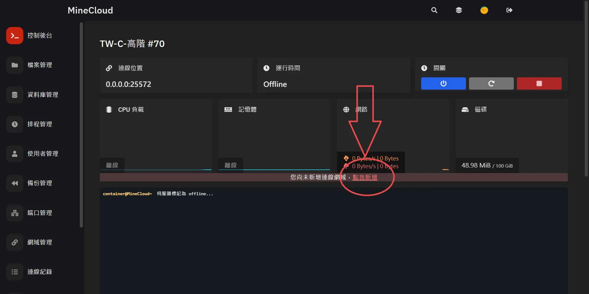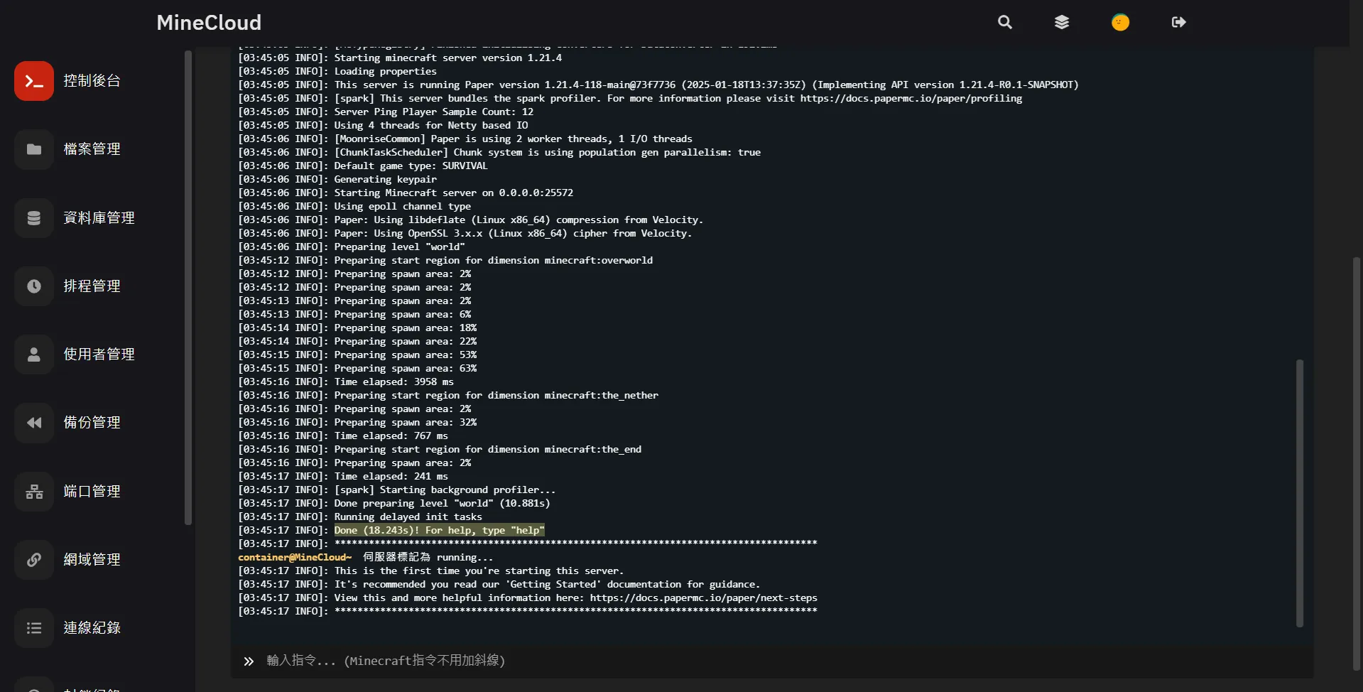- 完成啟動會顯示 Done (XX.XXXs)! For help, type "help" 代表您可以從先前設定的連線位置連進伺服器,或滑到控制後台上方有連線位置可點擊複製