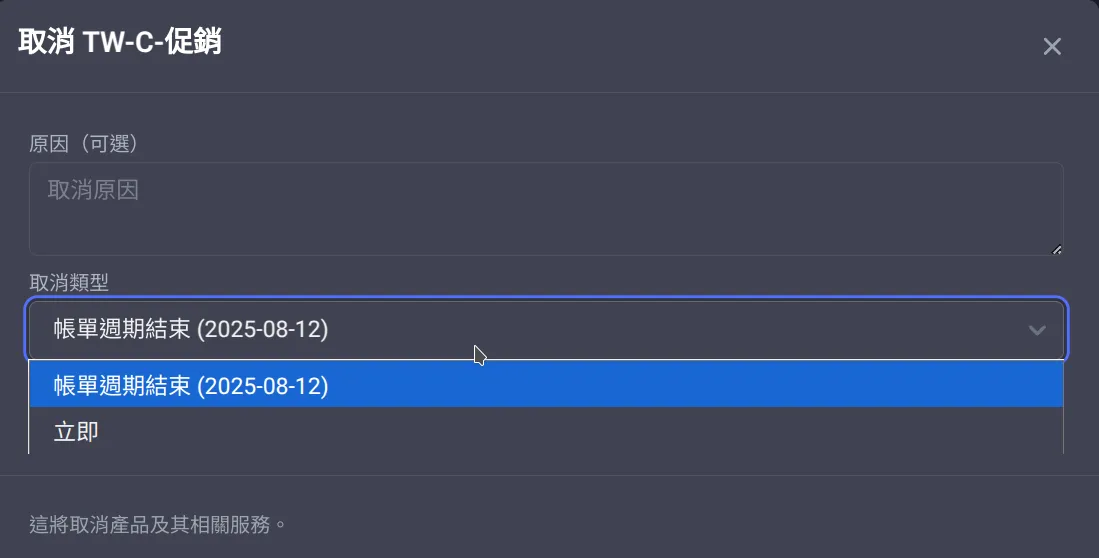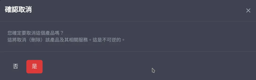 如選擇立即取消,系統將立即停止伺服器,並將伺服器檔案刪除 我們不會退還任何金錢
